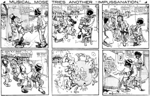 Musical Mose was a short-lived comic strip that featured a black musician who embarked on various humorous adventures and impersonation. The series touched on Musical Mose’s ability to adopt different social identities through his musical talent. The series challenges conventional white supremacy and added complexity to the main character dealing with a racial hierarchy in his own way. [read more…]